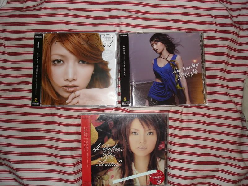 Namie and Super Monkey's 8CM singles ・愛してマスカット ・太陽のSEASON ・Stop the music ・Body Feels EXIT ・Chase the Chance ・Don't wanna cry ・You're my sunshine ・SWEET 19 BLUES ・a walk in the park ・CAN YOU CELEBRATE? ・How to be a Girl ・Dreaming I was dreaming ・I HAVE NEVER SEEN ・RESPECT the POWER OF LOVE ・SOMETHING 'BOUT THE KISS http://page8.auctions.yahoo.co.jp/jp/auction/h58857200 I've also got a bid on the toi et moi single which ends today. I'm also looking at getting Namie's break the rules album. ROFL. I know I spend way too much, but it has become an addiction. =P