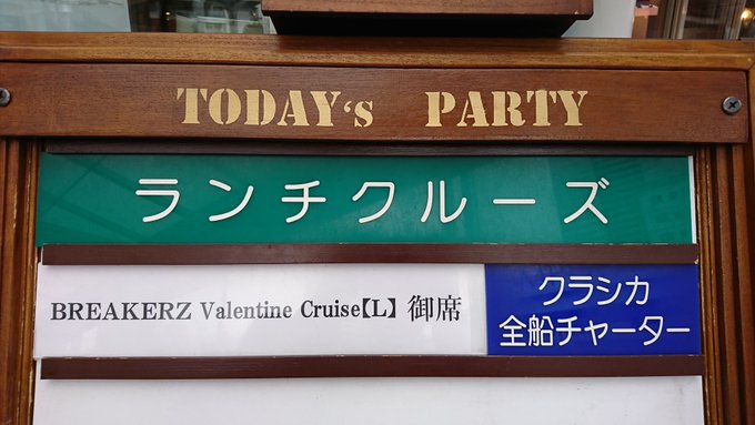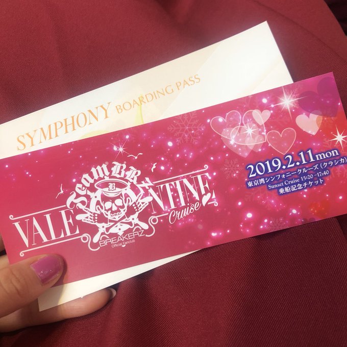 Event details as follows : BREAKERZ Valentine Cruise ♥ Date : 11th Feb 2019 (Today is a public holiday in Japan ie. Kenkoku Kinen no Hi) Venue : Tokyo Bay Cruise Symphony Classica Event has 2 timings sessions : Lunch Cruise : 12:00pm to 2.20pm Sunset Cruise : 3.20pm to 5.40pm All timings stated are in Japan time Cost : 29,000 Yen (tax included) Valentine Cruise Topics :: ★ BREAKERZ commemorative photography (photo taking will be done in groups , not individual) ★ team brz members are allowed to pass chocolates to the guys directly in person ★ Valentine Cruising - Special Talk & Mini Live ★ Valentine Cruising buffet ★ Valentine Cruising special goods included ※ team brz members must board the cruise ship 1 hour before it departs ※ Both Lunch Cruise & Sunset Cruise sessions have the same contents ※ 2nd person accompanying a team brz member not necessary has to be in the fanclub him/herself but the person who balloted for the tickets has to be a team brz member ※ Participation fee is required for children over 6 years old (Pre schoolers are not allowed to attend BREAKERZ Valentine Cruise ♥) Taken at Tokyo Bay Cruise ![]() https://twitter.com/ryu112948/status...82182550208513 BREAKERZ Valentine Cruise ♥ Lunch Cruise ticket ![]() https://twitter.com/meganai_msk/stat...85778687795200 Hopefully fanclub members are allowed to post online on what songs the guys performed during the Mini Live