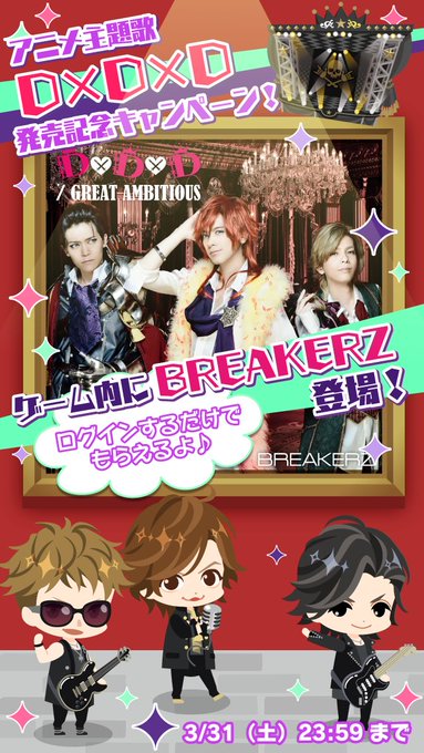 Attending this duo event will be based on lottery . More details : BREAKERZ & guest special talk show + BREAKERZ mini live Special talk show guest : voice actor Kimura Ryohei Date : 20th April 2018 (Fri) Time : 6.30pm ; fans will be allowed entry from 6pm onwards Event Venue : Tokyo's Animate Shinjuku B2 floor animate hall SHINJUKU How to win a chance to attend BREAKERZ & guest special talk show + BREAKERZ mini live : The CD Only Dame Pri version of D×D×D / GREAT AMBITIOUS -Single Version- has to be purchased either via Animate Online and/or any of the physical Animate stores (except for Animate Tokushima) . For every purchase , an application form with a serial number will be included together with the CD . Animate Ikebukuro will not be giving away the application forms tomorrow to Wed due to Wed's D×D×D/GREAT AMBITIOUS -Single Version- 1st release event . Fans can apply a chance to attend BREAKERZ & guest special talk show + BREAKERZ mini live between tomorrow / 6th March to 1st April (11.59pm Japan time) . http://breakerz-web.net/news/release_030.html