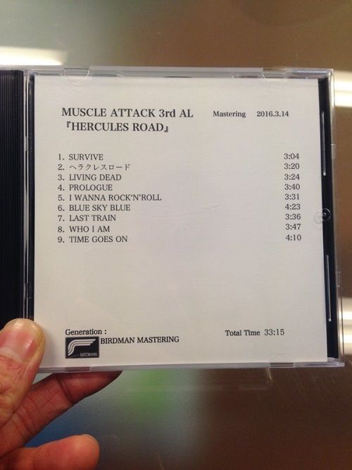 This morning , SHINPEI mentioned on his blog that mastering of MUSCLE ATTACK's HERCULES ROAD album was done last night . In addition , SHINPEI posted a photo of the finished mastered copy of HERCULES ROAD which included the total/separate time duration of the entire album : ![]() 1) SURVIVE ; 3:04 mins 2) Hercules Road ; 3:20 mins 3) LIVING DEAD ; 3:24 mins 4) PROLOGUE ; 3:40 mins 5) I WANNA ROCK 'N' ROLL ; 3:31 mins 6) BLUE SKY BLUE ; 4:23 mins 7) LAST TRAIN ; 3:36 mins 8) WHO I AM ; 3:47 mins 9) TIME GOES ON ; 4:10 mins Total duration - 33:15 mins http://yaplog.jp/brzshinpei/archive/3275
