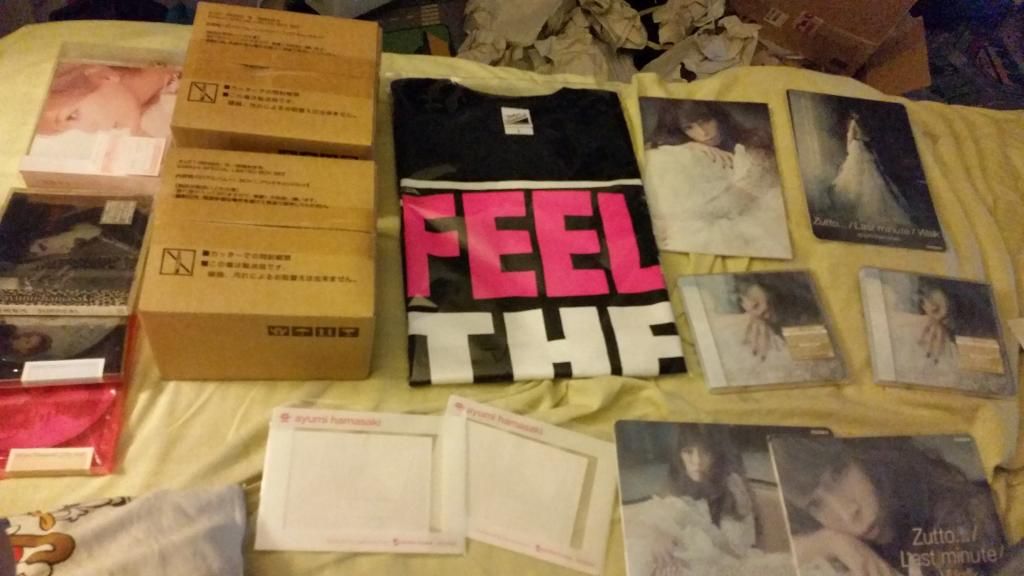 I am absolutely DYING waiting for my next batch of ayu stuff to come, but it's the new year so everything in Japan is closed and/or backed up, hahaha... but I got a few old DVD singles from book-off, 2 of the Feel the Love tour CDs, that old issue of Bomb with her on the cover (with the Growing Up Story article w/ baby pictures and a really long photo spread featuring her) plus a TON of magazine clippings, and also the fleece muffler/blanket TeamAyu members could get when You were.../BALLAD came out. PLUS the Happy Box, too...