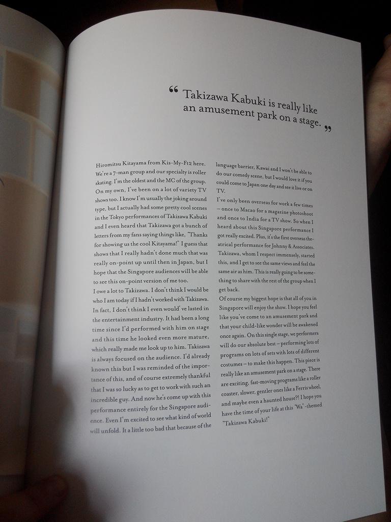 English interview writeup of Kitayama found inside the pamphlet ![]() The show was so amazing & seeing Kitayama live in person (he looked the same as in videos/concerts) , I was quite starstruck as where I was seated , he was always near the stage where I sat It was a great experience & thank goodness I made the right decision to attend it , it's not often I see Johnnys upclose & personal in my country