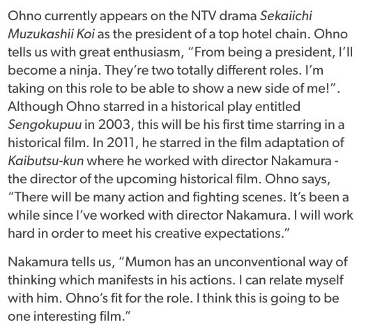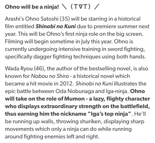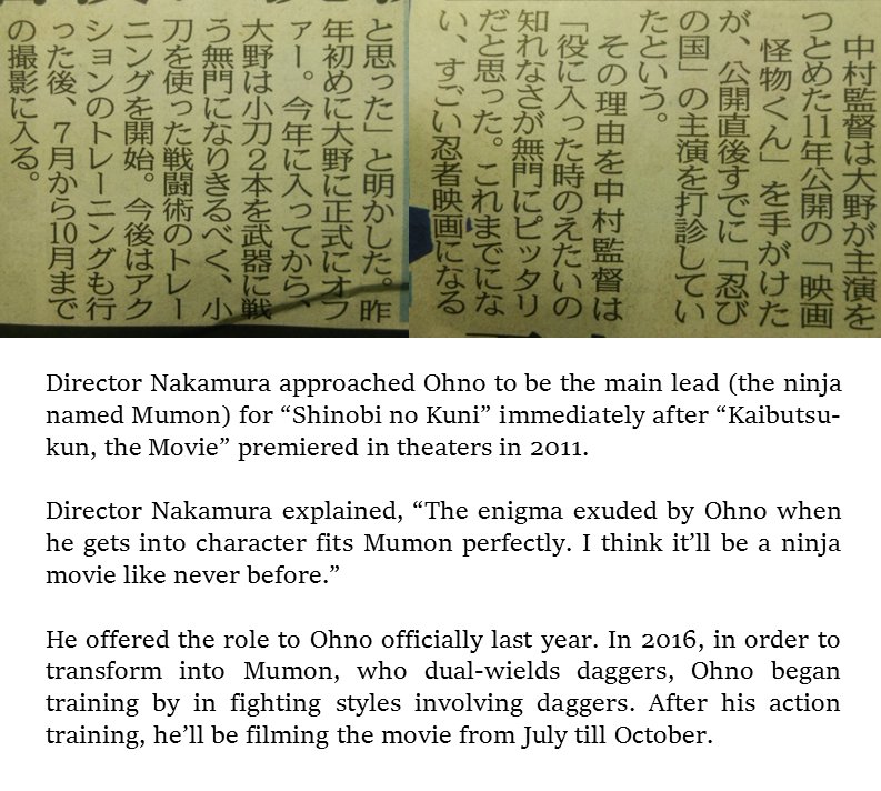 Total sales of the single now stands at around 786K http://www.oricon.co.jp/news/2072522/full/?ref_cd=tw Also , Ohno is starring in a new movie titled Shinobi no Kuni ![]() ![]() ![]() ![]() https://twitter.com/color5seaside/st...85040871464961