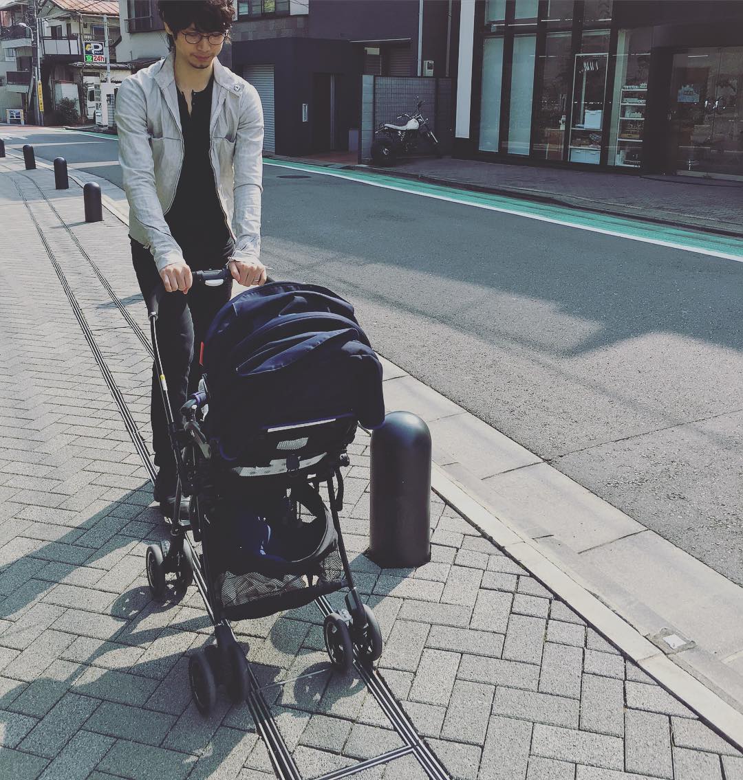 Mizushima Hiro takes baby daughter out for a stroll. She was born in June last year.