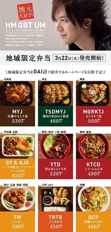 Hotto Motto is a Japanese fast food chain which specialised in takeaway bento & different bento flavours will be sold in 9 prefectures within Japan by utilising DAIGO's short word abbreviation . From's Hotto Motto's Facebook ![]() https://www.facebook.com/photo.php?f...47499485274422