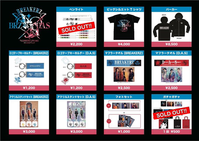 https://twitter.com/Musing_JP/status...48484694081536 All BREAKERZ VALENTINE LIVE 2022 -BREAKERZ VS D.A.S- goods except the penlight & gachagacha are now made available for order , as noted via http://breakerz-web.net/goods/valentine_live_2022/ BREAKERZ VALENTINE LIVE 2022 -BREAKERZ VS D.A.S- leftover goods will be shipped to buyers from end of Feb onwards こちらの商品を含むご注文は2022年2月下旬より順次発送となります https://musing.jp/shop/breakerz_goods/ Considering each fan can buy a maximum of 20 gachagacha at Sat's concert that's not a surprise no leftovers for that are available anymore x)