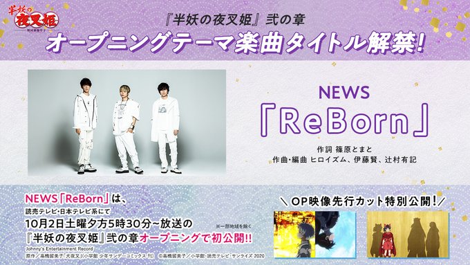 In the latest Marumaru radio broadcast , Masuda revealed that the new NEWS song that they've recorded for the next new 2nd opening theme no. for the Hanyou no Yashahime anime is titled ReBorn