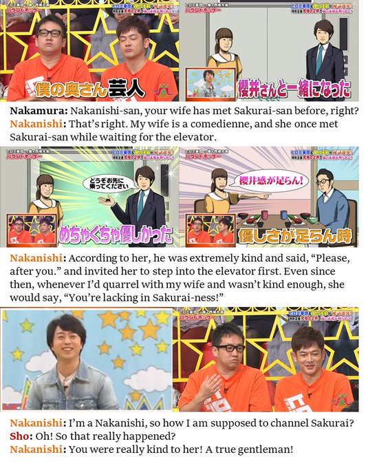 Thurs's VS ARASHI , comedian Nakanishi relates an episode of how Sakurai charmed his wife