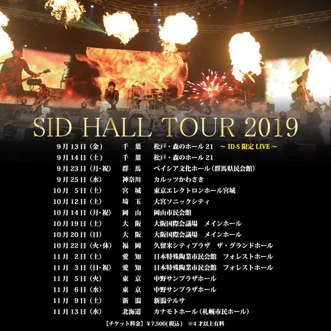 2019年9月13日(金)千葉県 森のホール21(※ID-S限定公演) 2019年9月14日(土)千葉県 森のホール21 2019年9月23日(月・祝)群馬県 ベイシア文化ホール 2019年9月25日(水)神奈川県 カルッツかわさき 2019年10月5日(土)宮城県 東京エレクトロンホール宮城 2019年10月12日(土)埼玉県 大宮ソニックシティ 2019年10月14日(月・祝)岡山県 岡山市民会館 2019年10月19日(土)大阪府 大阪国際会議場 メインホール 2019年10月20日(日)大阪府 大阪国際会議場 メインホール 2019年10月22日(火・祝)福岡県 久留米シティプラザ ザ・グランドホール 2019年11月2日(土)愛知県 日本特殊陶業市民会館 フォレストホール 2019年11月3日(日・祝)愛知県 日本特殊陶業市民会館 フォレストホール 2019年11月5日(火)東京都 中野サンプラザホール 2019年11月6日(水)東京都 中野サンプラザホール 2019年11月9日(土)新潟県 新潟テルサ 2019年11月13日(水)北海道 カナモトホール(札幌市民ホール) https://natalie.mu/music/news/335993 Unofficially SID HALL TOUR 2019 will kick off on 13th Sept but for that , only fanclub members are able to attend
