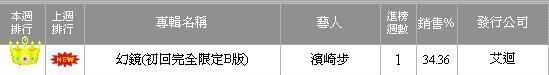 Mirrorcle world debuted at #1 on the Taiwanese Chart with sales of 34.36%...ayu-mi-x gold is still on the chart at #5 in its third week. (second week at #2, first week at #1)
