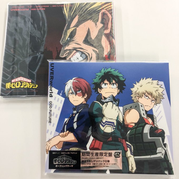 CD ![]() CD + DVD ![]() <収録曲> 1.ODD FUTURE 2.PLOT 3.CORE STREAM ◇初回限定盤DVD 「Q.E.D.」ミュージックビデオと2017年12月に行われた横浜アリーナでのTAKUYA∞生誕祭か ら「PRAYING RUN」のライブ映像を収録 CD Boku no Hero Academia anime version ![]() <収録曲>(期間生産限定アニメ盤のみ) 1.ODD FUTURE 2.PLOT 3.CORE STREAM 4.ODD FUTURE (short ver.) http://www.sonymusic.co.jp/artist/UVERworld/info/493423 CD only cover is great , CD + DVD not so Hopefully the song will be good