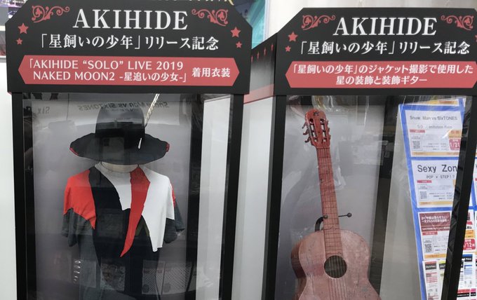Last Sun was not only was the 2nd day of AKIHIDE LIVE TOUR 2020 -Hoshikai no Shounen- took place at Motion Blue yokohama , it was also the last day that Tokyo's Tower Records Machida displayed AKIHIDE “SOLO” LIVE 2019 NAKED MOON2 -Hoshioi no Shoujo- outfit + Hoshikai no Shounen related props inside their store .