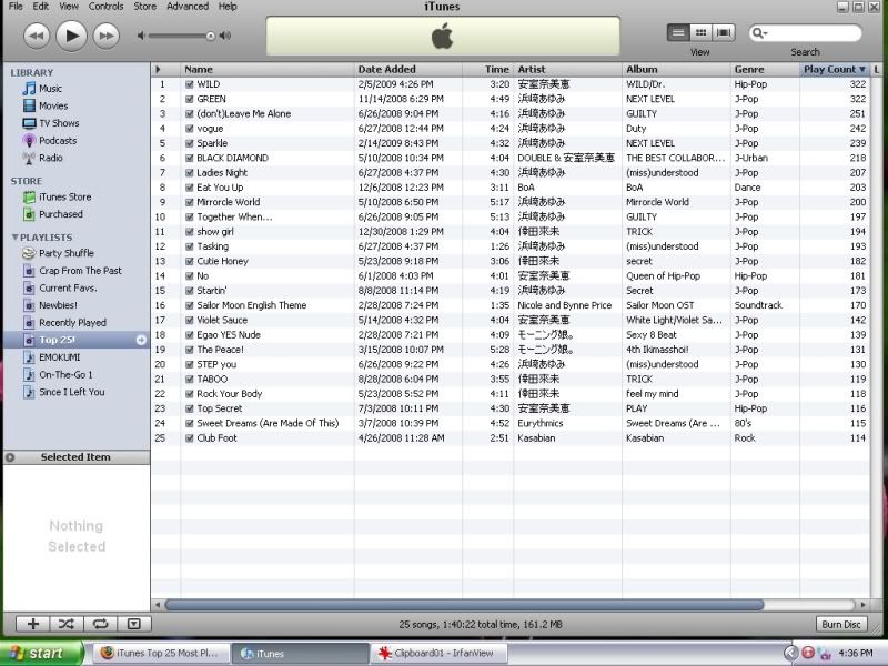 Old iTunes (saved on iPod): 01. GREEN (Original mix): Ayu - 943 02. Rule (Original mix): Ayu - 599 03. Be My Last: Hikki - 351 04. Spark: BoA - 322 05. 4 Minutes: Madonna - 248 06. Sparkle (Original mix): Ayu - 223 07. Sparkle (Original mix): Ayu - 207 08. Days (Original mix): Ayu - 206 09. GREEN (Original mix): Ayu - 203 10. Gunjou no Tani: alan - 175 11. Sora Uta: alan - 165 12. My Life Would Suck Without You: Kelly Clarkson - 161 13. Crazy World feat. AI: Anna Tsuchiya - 151 14. Follow the Nightingale: KOKIA - 144 15. Circus: Britney Spears - 135 16. Himawari: Fukuhara Miho - 128 17. (don't) Leave me alone: Ayu - 126 18. Marionette: Ayu - 119 19. RED CLIFF~Shin Sen~: alan - 114 20. Doushite Kimi wo Suki ni Natte Shimantandarou?: DBSK - 113 21. Koi wa groovyx2: Yuna Ito - 111 22. Together When...: Ayu - 105 23. Womanizer: Britney Spears - 103 24. This is not a love song: Koda Kumi - 103 25. TO BE (10th Anniversary Version): Ayu - 103 New iTunes: 01. don't say "lazy" -TV size-: K-ON! ED - 31 02. Curtain call: Ayu - 20 03. Ima Demo Aitaiyo: Yuna Ito feat. Spontania - 19 04. Kibun Joujou↑↑: Bentley Jones - 11 05. rollin': Ayu - 10 06. identity: Ayu - 9 07. Ima Demo Zutto - Spontania feat. Yuna Ito - 7 08. EnergizE: Ayu - 7 09. Together When...: Ayu - 5 10. NEXT LEVEL: Ayu - 4 11. Sparkle: Ayu - 4 12. POWDER SNOW [Live]: Ayu - 4 13. Sunao ni Naretara ~FINAL NIGHT~: Bentley Jones - 3 14. Rule: Ayu - 3 15. LOVE 'n' HATE: Ayu - 3 16. until that Day...:Ayu - 3 17. Gekkou: Bentley Jones - 2 18. Depend on you <Depend on Me ver.>: Bentley Jones - 2 19. Don't Let Me Stop You: Kelly Clarkson - 2 20. Whyyawannabringmedown: Kelly Clarkson - 2 21. Lady-Rise: SWEET BLACK feat. MAKI GOTO - 2 22. again: YUI - 2 23. It's all Love!: Koda Kumixmisono - 2 24. Marionette: Ayu - 2 25. JEWEL: Ayu - 2