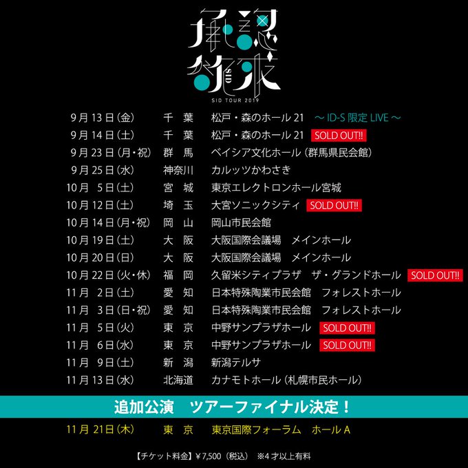 SID has sold out another SID TOUR 2019 -Shounin Yokkyuu- concert date on 22nd Oct