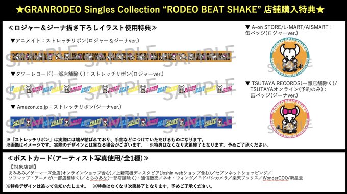 Roger & Gina related items Animate : Stretch Ribbon (Roger & Gina ver.) Tower Records Japan (excluding some stores) : Stretch Ribbon (Roger ver.) Amazon Japan : Stretch Ribbon (Gina ver.) A-on STORE/L-MART/A!SMART : Can Badge (Roger ver.) TSUTAYA RECORDS (excluding some stores) / TSUTAYA Online (reservations only) : Can badge (Gina ver.) Postcard (different images used for all postcards) Ami Ami Gamers (including online) Joshin Denki Disk Pier (including Joshin webshop) 7/11 Net Sofmap Animega (some stores excluded) Tora no Ana (some stores excluded) Neowing / CDJapan Yodobashi Camera Rakuten Books WonderGOO / Shinseido https://granrodeo.net/news/informati...shake_tokuten/